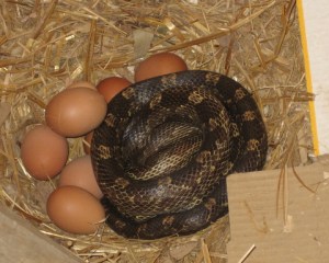 These snakes are terrible egg thieves and have been known to eat chicks also. They would rather flee a person than strike, but they are brazen enough to steal eggs right out from under a setting hen.