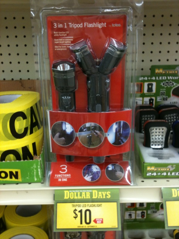 7.  Multi-purpose light.  Our son thought this LED flashlight would be particularly cool for hanging inside a tent so that the light would penetrate all areas rather than just one spot of light in the center.  (Now that we’ve opened it, I can see that all 3 flashlights can be removed from the tripod base to be used individually too.  Hanging it from the top of the tent would take a little Boy Scout ingenuity since there is not a hook).