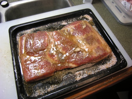 - After 7 or so days, remove the belly from the bag, throw the liquid away, and rinse the belly with cool water removing the curing salt from the surface. Pat dry.